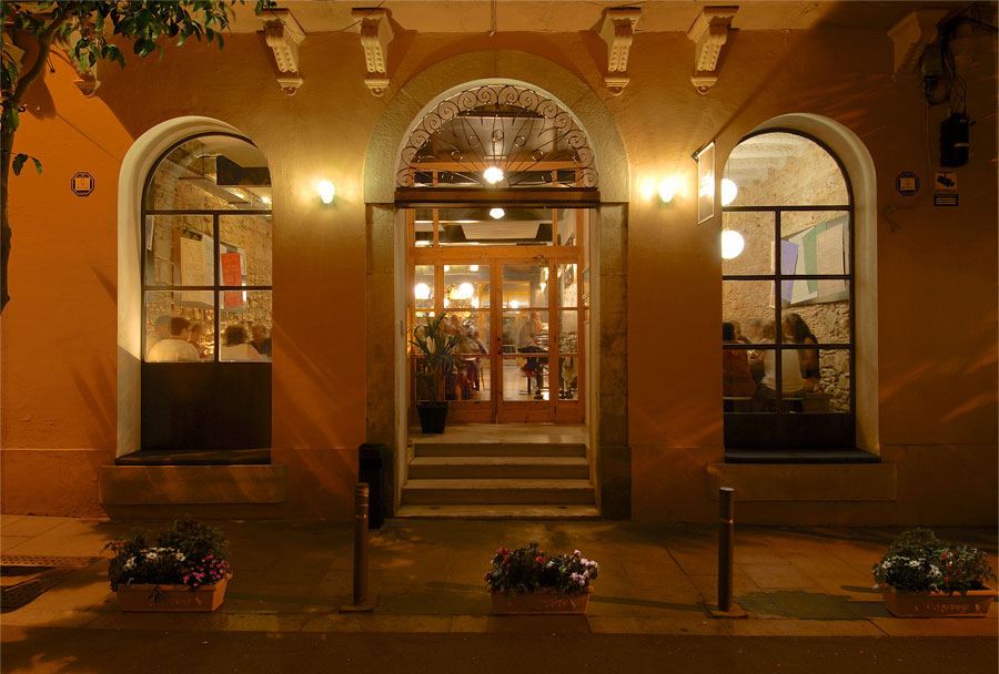 A nighttime view of SOHŌ Café + Kitchen, a modern glass-fronted café with warm interior lighting. Several people are seated inside enjoying conversations and drinks.